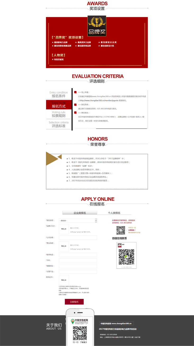 中國充電樁網(wǎng)是國內(nèi)首家充電樁行業(yè)門戶,此次開發(fā)投票系統(tǒng),用于行業(yè)評選,訪問者可在線申請,上傳附件,證件等一系列資料,后臺可查看信息,通過后可參與評選,整體風(fēng)格美觀大方,功能齊全!